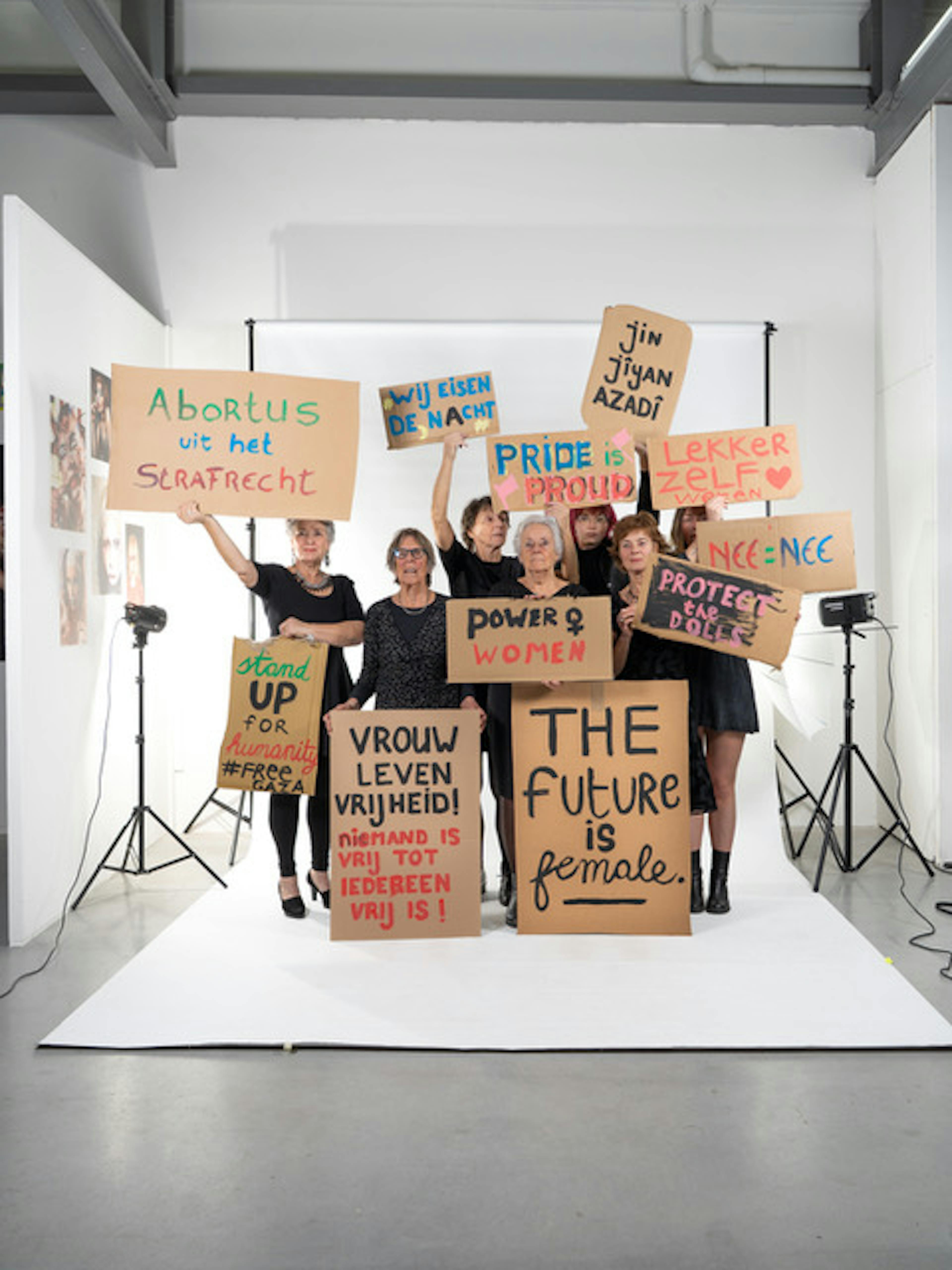 Activisme in je kledingkast: Dolle Mina’s in Helmond. We werken al een aantal weken met lokale activisten — Dolle Mina’s en Vrouwenbrigade-leden van toen en nu. Twee generaties feministes openden hun kledingkasten en onderzochten hoe kleding verzet en emancipatie zichtbaar maakt en hoe kleding symbool is voor strijd, vrijheid en zelfbeschikking. Het resultaat: een bomvolle beeldcollage van portretreeksen in de lichtstraat van de Cacaofabriek.